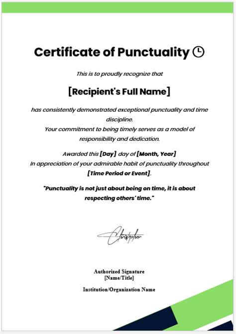 Punctuality is a crucial aspect of professional development. By receiving certificates for punctuality, individuals enhance their professional reputation and increase their chances of career advancement. Employers value punctuality as it reflects reliability, responsibility, and commitment.